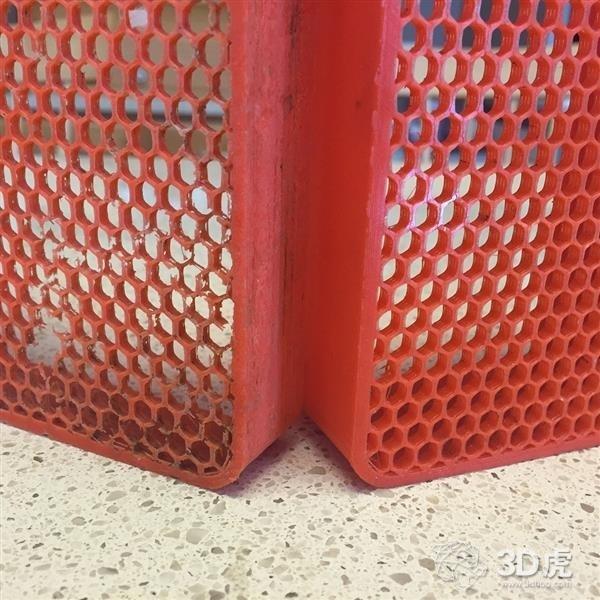由上图可见,右边的那个只用了一周的PLA 3D打印过滤网只是稍微脏了点,没什么变化;而左边的那个已经明显褪色,变得多孔而且发脆,上面的网格结构也开始破裂。