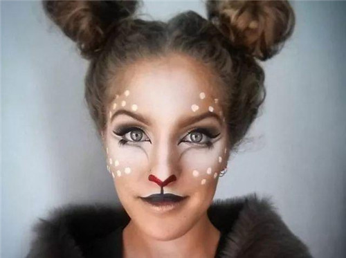 Tips:一定要记得把鼻影刷重刷重再刷重,一气呵成千万别化歪哦!画不出小麋鹿可爱的斑点,也可以突出眼妆部分,用长长的眼睫毛来夺人眼球。