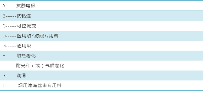 特征单元2为聚丙稀商品的适用范围或生产加工方式、关键特性及防腐剂等。均用相应的英文英文字母作代号。代号自左至右排序,先后称第一位、第二位、第三位和第四位。表明原材料主要用途或生产加工方式在第一位写成,关键特性、防腐剂等在第二至第四位写成。见表1。