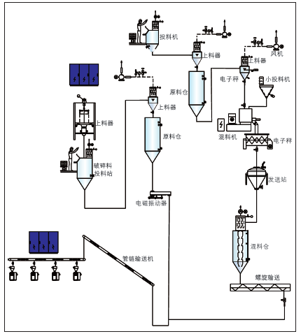 此外,在集中化供料系统软件中的原料混和工艺流程中,为了更好地确保PVC、碳酸钙、秘方料的混和品质和混和高效率,一般期待添加一定占比的粉料一起开展拌和。