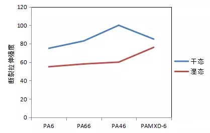 比照各种各样四种尼龙在二种情况下的开裂拉涨抗压强度,脂环族尼龙吸湿后抗拉强度降低力度较,在其中PA46的减幅在40%上下,而脂环尼龙PAMXD-6的减幅在10%上下。