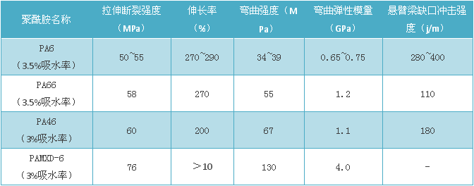 以上是四种尼龙在干态和一定吸水性情况下的力学性能数据测试比照。四种尼龙的拉申、弯曲强度,及其应变速率都是有一定水平的降低,而延伸率和冲击性抗压强度则有提升。