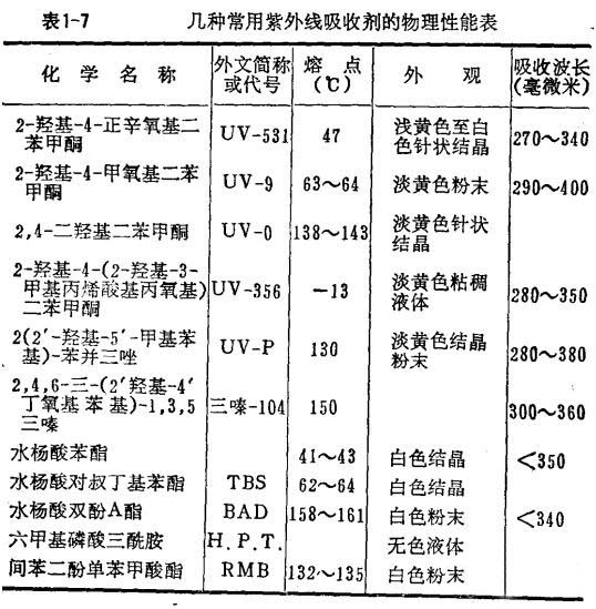 现将几类常见橡胶助剂紫外线吸收剂的特性列于表1-7。