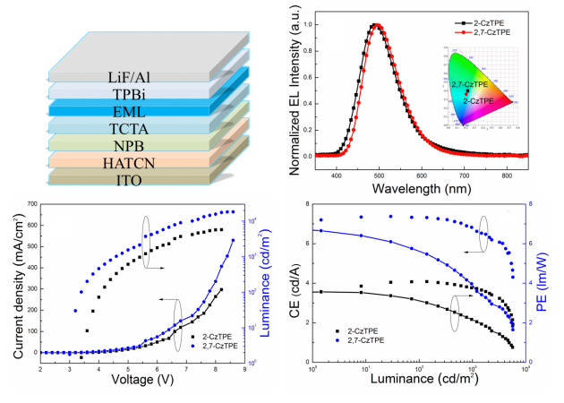 研究结果显示,相较于化合物2-CzTPE,2,7-CzTPE不仅显示了良好的AIE性能和固态发光效率 (PLQY= 60.63%),同时在非掺杂器件 (ITO/ HATCN/NPB/TCTA/EML/TPBI/LiF/Al) 中,2,7-CzTPE也显示了优异的发光性能,其启亮电压仅为2.9 V,最大电流效率为7.38 cd/A,外量子效率为3.0%。