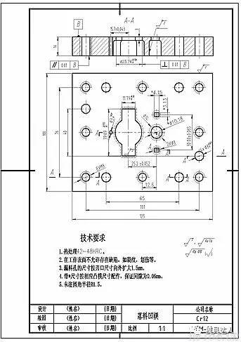 ● 复杂性孔的尺寸标注。样子越繁杂,尺寸就越大,从而导致的标注艰难是新手设计方案冲压模具时的关键阻碍。如图所示1-77所显示的凸模固定不动板零件,因洞边样子的尺寸多种多样而出現标注艰难。这时有两个解决方案:一是变大标注法,将凹模零件图适度变大后再标注尺寸;二是移除变大标注法。将繁杂的洞边型孔独立挪到零件图外边的合适部位,再独立标注型孔尺寸,而零件图内仅标注型孔图型的部位尺寸就可以。