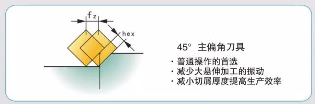 在面铣生产加工中,切入夹角45°的面铣刀会使切削越来越更薄。伴随着切入角的减少,切削薄厚会低于每齿切削速度,而这相反能够 使走刀率提升到原先的1.4倍。 45°主倾角铣刀的轴向切削力大幅减少,等于轴径切削力,切削荷载遍布在很长的切削刃上,具备非常好的抗振性,适用数控镗床主轴轴承悬 伸较长的生产加工场所。用此类刀具生产加工平面图时,刀头损坏率低,耐磨性能高; 在生产加工铸造铁件时,工件边沿不容易造成崩刃。