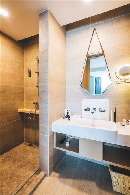4.卫生间一角,摆放着网易严选的洗护用品。