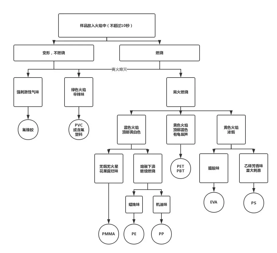 燃烧鉴别是比较流行的方法,它是利用小火燃烧塑料试样,观察塑料在火中和火外时的燃烧性,同时注意熄火后,熔融塑料的落滴形式及气味来鉴别塑料种类的方法。