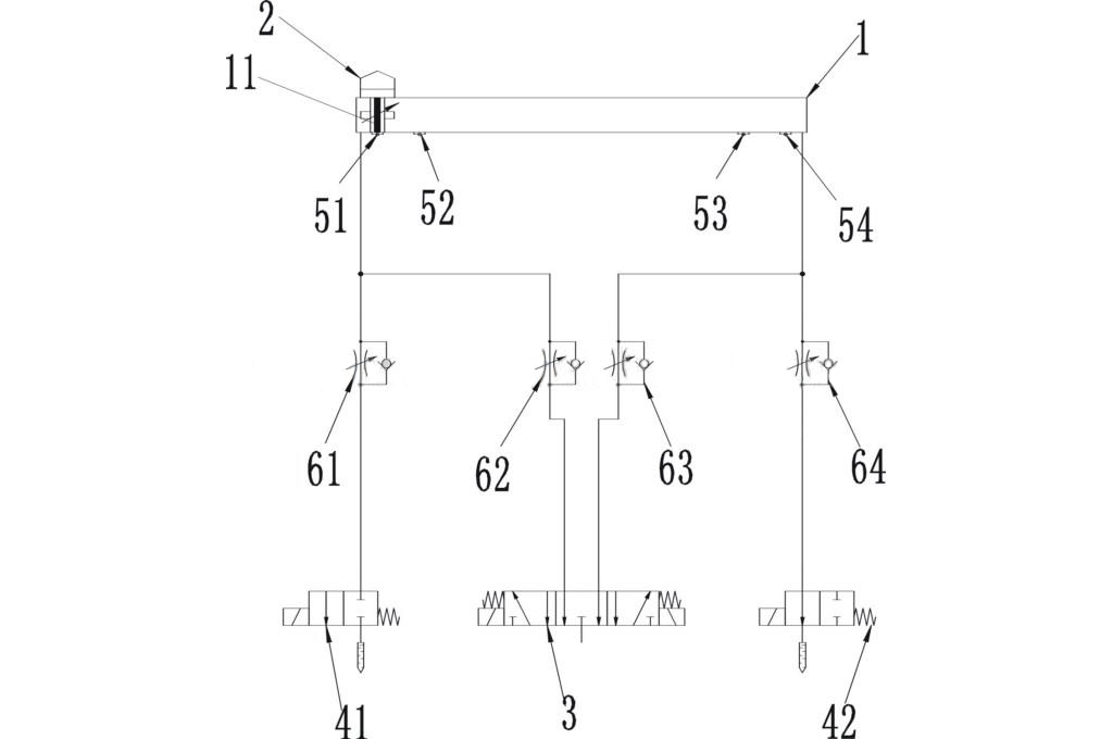 无杆气缸中设立导轨滑块,还设立一个中泄式的三位五通继电器、2个俩位两通继电器。无杆气缸的左边设立第一限位开关、第二限位开关,无杆气缸的右边设立第三限位开关、第四限位开关。该实用新型专利能大幅度减少导轨滑块与无杆气缸的轴承端盖碰撞的强烈水平。