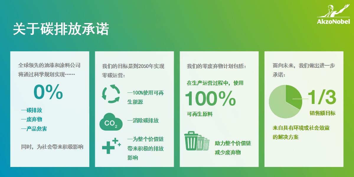现阶段,阿克苏诺贝尔的可再生能源利用率为40%;2016年,企业近一半工厂的碳排放量获得改进。在当今考试成绩的基本上,阿克苏诺贝尔将提升实行“永续佳园”可持续发展发展战略,从而制订了一系列总体目标。