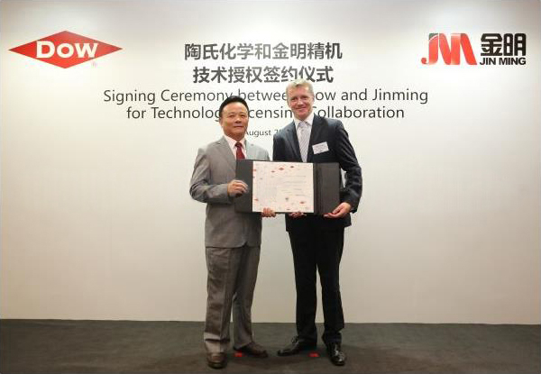 据统计,2014年8月5日广东省金明精机与英国陶氏化学企业于签定了《许可协议》,陶氏化学与金明精机战略合作,独家授权金明精机生产制造、应用、市场销售PVDC包囊技术应用机械设备。