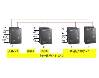 为考虑客户要求,台达应用工程师应用4台台达油电伺服驱动器VFD-VJ系列产品做为每台机器设备的四泵分合流油电伺服电机驱动器计划方案,另外配搭客户现有的电机和汽油泵,组成每台机器设备的四泵分合流系统软件。根据合流实际操作,考虑塑料机射胶姿势大流量要求及保压时的工作压力精确;根据分离实际操作,完成出模、托模与熔胶姿势的连动。