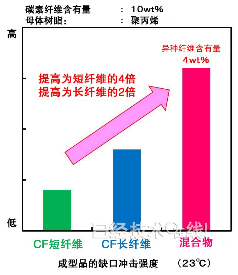 抗冲击性提升,射出去成型的长纤维CFRTP与短纤维CFRTP对比抗冲击性高些,而混和有异种纤维的开发品(化合物)有着长纤维CFRTP二倍的抗冲击性。