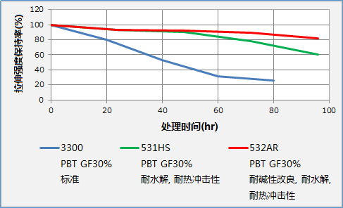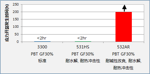 最近的试验评价表明,当试样浸泡在碱中,标准材料DURANEX® 3300和耐水解、耐热冲击的DURANEX® 531HS在两小时内发生开裂。然而,DURANEX® 532AR即使浸泡200小时也不会发生应力开裂。