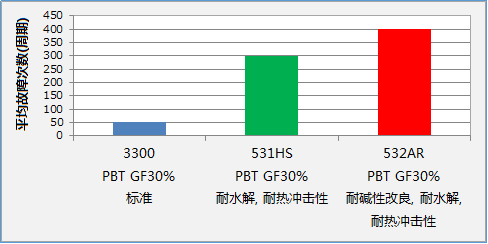 汽车零件对于耐久性、安全性、可靠性的要求日益提高,为此DURANEX® 532AR不仅降低了碱性物质导致的应力开裂,还针对热冲击损坏以及PBT树脂耐水解性差的缺点采取相应的对策。本品级即使处于汽车底盘部位和引擎室内等对于树脂来说非常严酷的环境下,也具备非常高的可靠性和寿命。