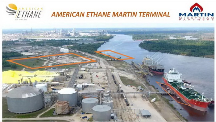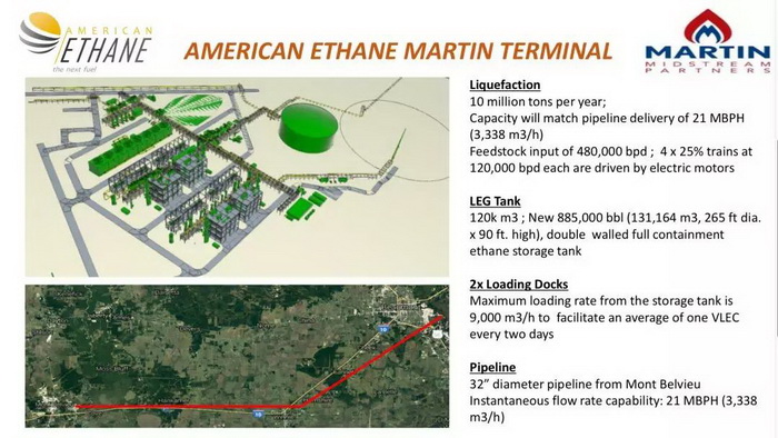 美国乙烷公司将Martin Terminal建设一个年出口能力达1000万吨的液态乙烷出口终端。该终端将包括新建一个乙烷装卸泊位,改建一个现有的泊位,使每个泊位都能够接受15万立方米乙烷运输船。出口终端的主要设施还包括4节年处理能力达1000万吨的深冷液化装置,以把纯度在95%以上的纯净乙烷深冷到-90度,以便装船出口;一个12万立方米的深冷液态乙烷全容储罐;连接 Mont Belvieu 直径32英寸长度达55英里的专用乙烷管线及相应的配电站。