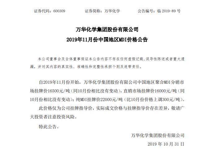 求稳!万华化学11月份MDI价钱维稳,坚持原价钱不变动