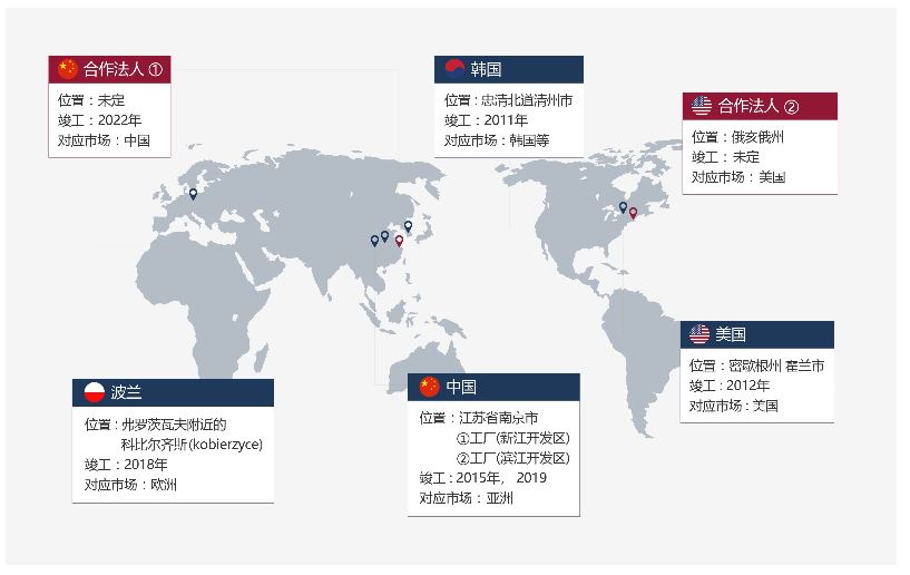 LG化学是唯一拥有全世界4角生产系统的公司,其中包括韩国在内的,世界三大电动汽车市场,美国,中国和欧洲。随着合资企业的成立,LG化学将拥有5个自有生产工厂和2个合作生产工厂等共7个生产基地。 (参阅参考资料2)