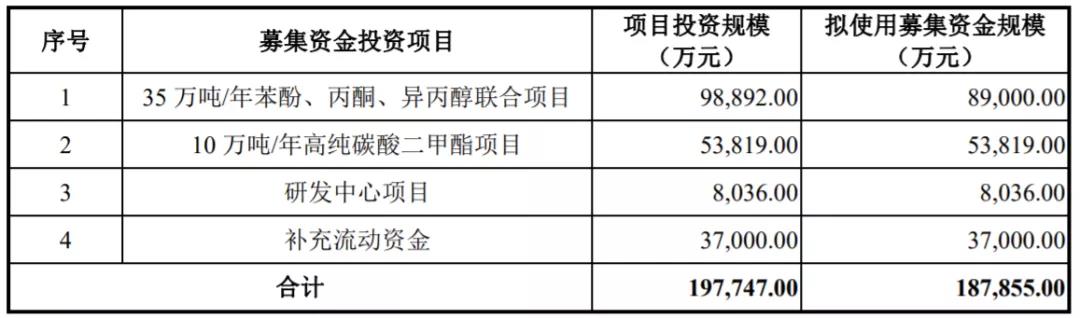 募资计划投资建设的“35万吨/年苯酚、丙酮、 异丙醇联合项目”、“10 万吨/年高纯碳酸二甲酯项目”建设投产,新增35 万吨 /年苯酚、丙酮产能,建成后发行人将是国内最大的苯酚、丙酮生产企业;同时还将新 增异丙醇和碳酸二甲酯等产品产能,产品进一步丰富,产业链进一步延伸和完善。
