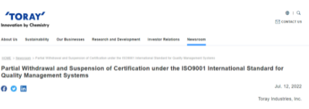 东丽撤销了部分产品的国际质量管理体系标准认证