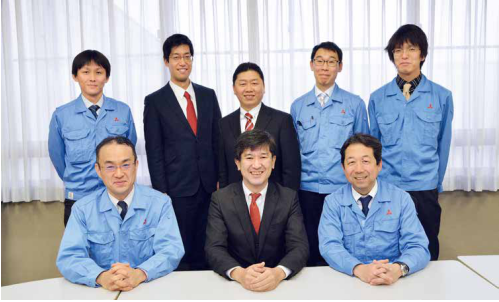 参加 MEIII 开发设计工作中的 MHIPT 和倍福企业的职工。前座,从左往右:Takashi Takii(MHIPT 工程部经理),Toshimitsu Kawano(倍福日本子公司主管)和 Takashi Mizuno(MHIPT 设计部主管和最先执政官)。后排座,从左往右:Tomohiro Umeda (MHIPT 工程项目处处长负责人),Osamu Aoishi(倍福日本子公司),Masanori Obata(倍福日本子公司),Tsutomu Ayusawa(MHIPT 设计部负责人)和 Yasuhiro Kai (MHIPT 设计部)