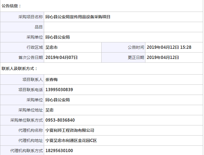 (来源:中国政府采购网) 一、项目名称 :同心县公安局宣传用品设备采购项目 项目联系人:杨硕联系电话:0953-6528480、18295630100 二、采购编号 :2019NCZ(WZ)000233 三、采购方式 :公开...