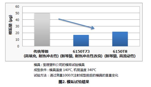 2.低逸气(低模垢)特性 ※低逸气=LowOutgassing殊不知,这种历经耐高温冲击性特性改进后的级别,会造成许多由增韧剂来历的汽体而造成的模垢,造成 模貝维护保养頻率提高的难题。此外,随着商品的轻巧化,对高些流通性原材料的要求越来越大。殊不知,提升流通性和提高延展性以授予耐高温冲击性,一般 是本末倒置的二项规定。因而,大家以往一直觉得,设计方案兼顾高流通性和耐高温冲击性的PPS原材料非常艰难。近期,本企业对PPS分子结构及其各种各样防腐剂开展分配,并对混和技术性开展改进,总算攻破了所述课题研究,开发设计出新式高添充高韧性级别的DURAFIDEPPS6150T73及6150T8。DURAFIDEPPS6150T8改进了高流通性和耐高温冲击性,DURAFIDEPPS6150T73具备高些的耐高温冲击性,并且二者均具备低逸气(低模垢)的优势,有希望在普遍行业及不同产品中获得 运用。图2为模垢,图3显示信息流通性与耐高温冲击性间的关联。 如上所述,DURAFIDEPPS的新式高填充高韧性级别组,具备出色的抗冲击、耐高温冲击性 能,是兼顾高流通性及低逸气的原材料。这种新材料将提升设计产品的可玩性,另外减少模貝 维护保养頻率,提升生产率。