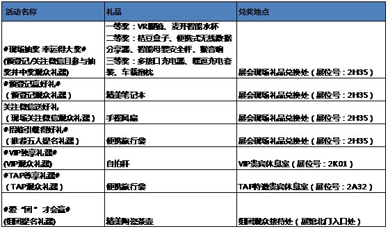 为提升观众们感受,提升交互性,展会当场将进行对于预备案观众们、组队观众们、当场主题活动互动交流观众们等多局抽奖,礼品有VR近视眼镜、智能保温杯、桔豆小盒子等。