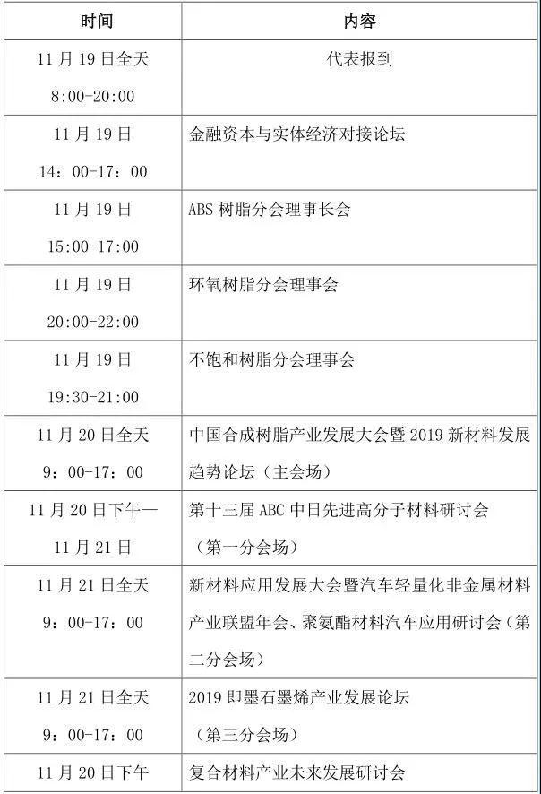 大会同期还将举办“金融资本与实体经济对接论坛” “第十三届ABC 中日先进高分子材料研讨会” “新材料应用发展大会暨汽车轻量化非金属材料产业联盟年会、聚氨酯材料汽车应用研讨会” “2019 即墨石墨烯产业发展论坛”和“复合材料产业未来发展研讨会”。