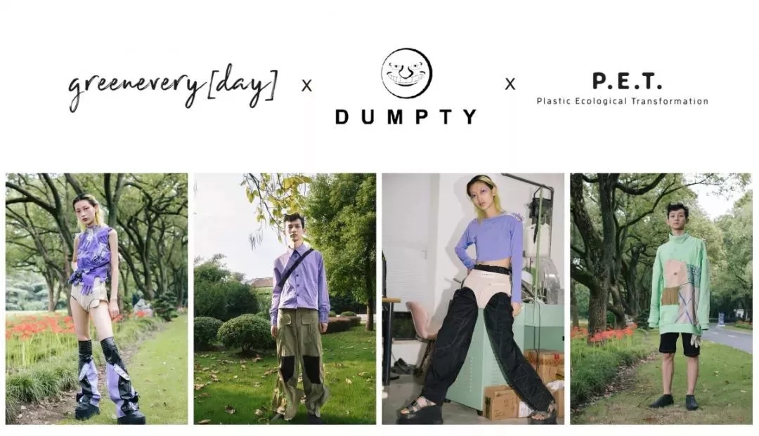 Dumpty设计团队创作此系列使用由P.E.T.(Plastic Ecological Transformation)提供的可持续面料,这批面料的制作来自4000多个塑料瓶,每米面料约使用11-17个塑料瓶降解后再生制作而成。