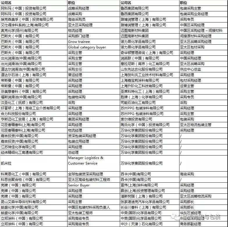 阿科玛;阿克苏诺贝尔;埃克森美孚;艾道玛;艾津农化;艾森半导体;艾仕得涂料;翱蓝特;巴斯夫;拜森化工;碧辟;波士胶;常熟市汇邦新材料;出光润滑油;传化;道达尔;道康宁;德谦化学;帝斯曼;东胜;杜邦农化;芬美意;福斯;德美;汉高;汉姆德华;汉圣;好富顿;好收成;亨斯迈;花臣;嘉宝莉;嘉实多;嘉荣;江山农化;江苏司能;江苏扬农;金力泰;金陵力联思;金山联贸;康普顿;科莱恩;科思创;壳牌;可兰素;昆山石梅;朗盛;立邦;利安隆;铃鹿;龙蟠;路博润;迈克斯;迈图;南宝树脂;南京红宝丽;宁波汉圣;纽佩斯树脂;欧诺法;庞贝捷;奇华顿;前程石化;瑞佳;润英联;塞拉尼斯;沙多玛;沙提;山东泰和;上海华谊;上海纳克;上海昭和高分子;上纬;圣莱科特;胜牌;石家庄鑫隆威化工;苏州金驼铃;索尔维;泰和;陶氏;瓦克;万华;先正达;宣伟;雪佛龙;亚什兰;洋紫荆油墨;艺康;英威达;赢创;优雅化工;赞宇科技;湛新树脂;张家港迪克;张家港协尔维;长春化工;长谷川;长兴;浙江传化华洋;浙江卫星;镇江联成;中远关西;中远佐敦;重庆斯托赛克蓝峰;庄信万丰;紫荆花;佐敦