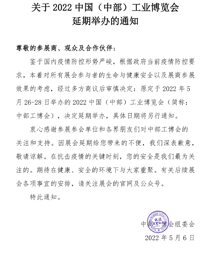 中部工博会组委会发布公告:鉴于国内疫情防控形势严峻,经过多方商议后决定,原定于2022年5月26-28日举办的2022中国(中部)工业博览会延期举办,具体日期将另行通知。详细通知如下: