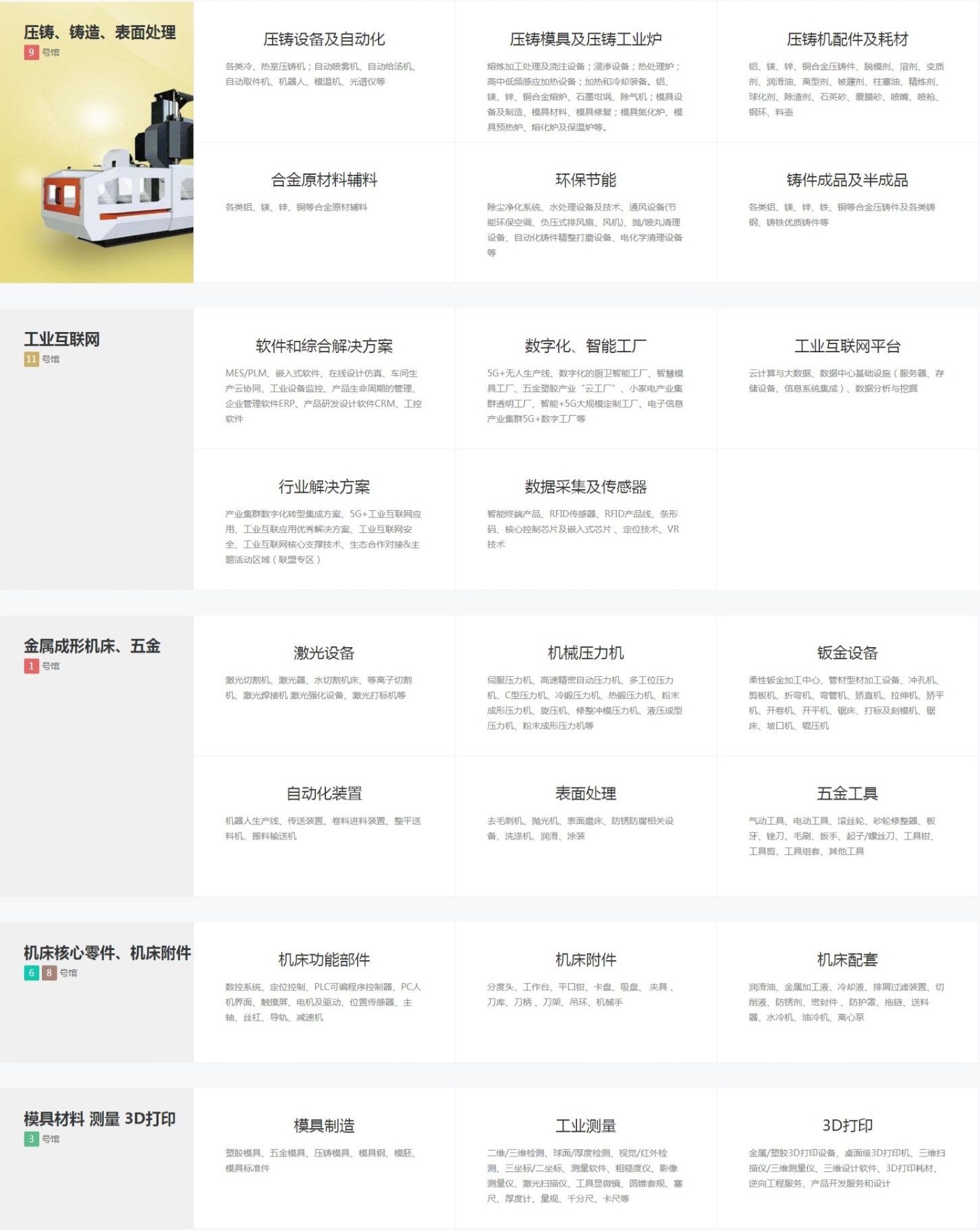 展品涉及数控机床、数控刀具、智能制造系统、工业机器人、钣金激光、塑胶及包装、模具制造、3D 打印、精密零件等各个领域。