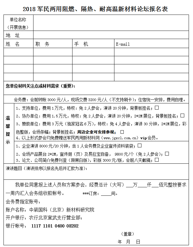 二、【参会对象】研究、生产及应用阻燃、隔热、耐高温新材料的科研院所、高校、企业、海装,陆装,空装单位,3D打印及相关分析测试仪器、加工设备单位等。