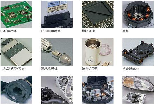 微型开关、电容器、光电断路器、SMT对应连接器、光纤连接器、各种绕线管、晶体管密封、硬盘激励器线圈密封、一般电气·电子零部件、CD驱动器光学拾波器底座、DVD旋转球光学拾波器底座、硬盘驱动电机轴承、电动机绝缘装置、纽扣电池绝缘密封、液晶投影仪外壳、家电零部件等其他、液晶投射TV灯外壳、微波炉零部件、电磁炉灶台、灯座、吹风机喷嘴、蒸气熨斗零部件。