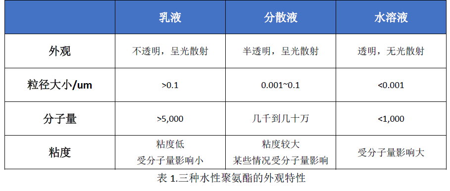 已有人阅读此文 - -以外观分类。水性聚氨酯可分为聚氨酯乳液、聚氨酯分散液、聚氨酯水溶液。实际应用最多的是聚氨酯乳液及分散液,其外观特性如表1所示。