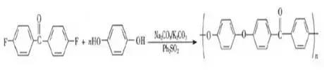 PEEK的合成是以4,4-二氟二苯甲酮、对苯二酚和碳酸钠为原料,以二苯砜为溶剂,在氮气的保护下,在逐渐升温至接近聚合物熔点的温度(320℃)时得到高分子PEEK树脂。其反应式如下: