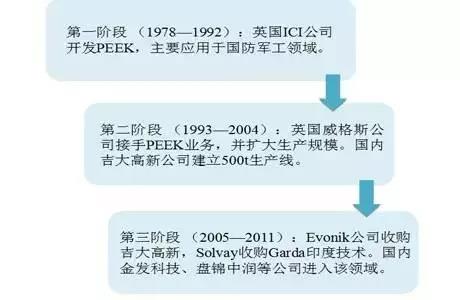 我国于20世纪80年代进行PEEK技术研发,并在90年代初投入小批量商品化生产,“九五”期间长春吉大高新材料公司完成工业中试生产。经过近20年的工作,吉林大学特种工程塑料研究中心开发出具有自主知识产权的PEEK树脂合成路线,树脂主要性能达到国外同类产品水平,而原料和设备全部立足于国内,降低了生产成本。