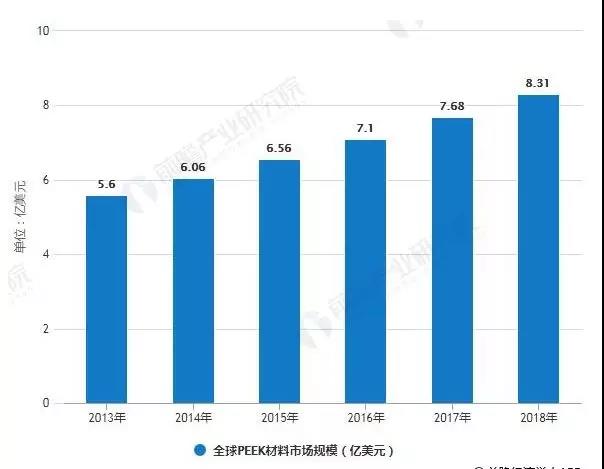 到2016年全球PEEK材料市场规模超7亿美元,截止至2017年全球PEEK材料市场规模增长至7.68亿美元,进入2018年全球PEEK材料(聚醚醚酮)迎来需求高峰,市场规模突破八亿大关,升至8.31亿美元。
