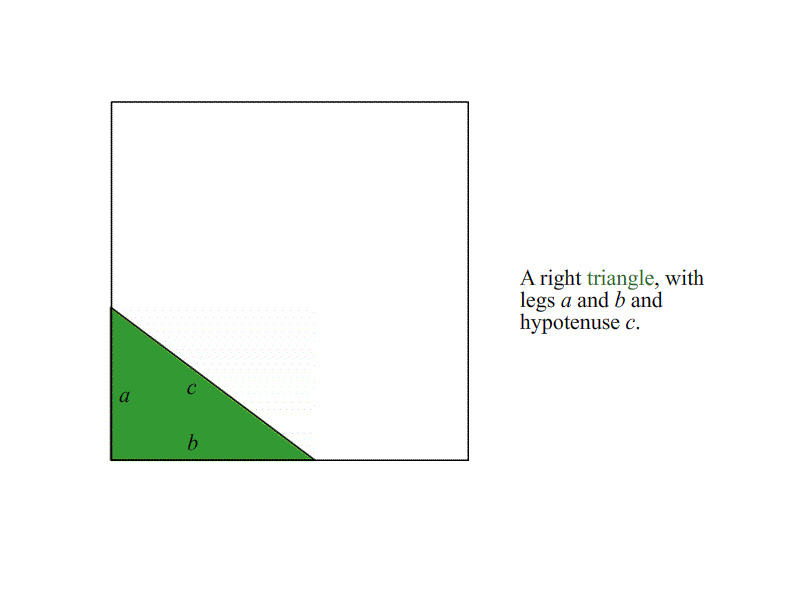 这个定理是我们对几何学理解的基础。它描述了平面上直角三角形的侧面之间的关系:将短边的长度a和b平方,将它们加在一起,并得到长边长度的平方,c。