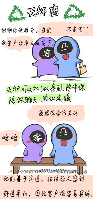 已有人阅读此文 - -天秤座常常追求和平和谐的感觉,他们善于交谈,沟通能力极强是他们最大的优点。他们的沟通方式往往让人感到舒适平和,因此能收到不错的客户评价。