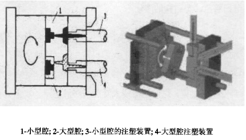 首先通过注成型出双色制件的第一部分,然后开模,合模,则第一次成型产品转入大型腔中成为嵌件,注射装置向大型腔中注射另一种颜色的塑料,将塑料嵌件进行包封,即可成型出双色制件。与此同时,注射装置向小型腔中注射第一种塑料,成型出下一塑料嵌件,待制品固化成型后开模,推出双色塑料件,动模旋转,闭模,即完成一次注塑成型周期。
