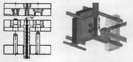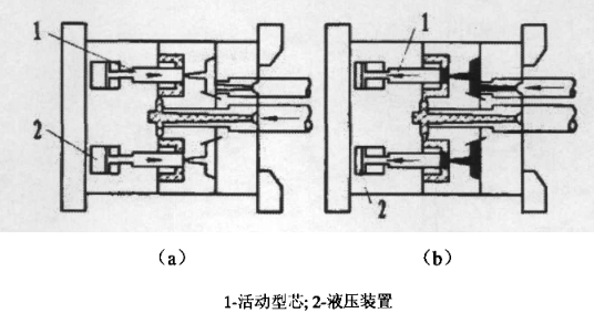 先将一次型芯移至模具型腔部位,合模、注射第一种塑料,然后冷却开模,安装在模具一侧的传动装置带动一次型芯和二次型芯的滑动,将二次型芯移至型腔部分,合模、注射第二种塑料,冷却、开模、脱出制品及完成一次成型。型芯滑动用于成型尺寸较大的塑料制件。
