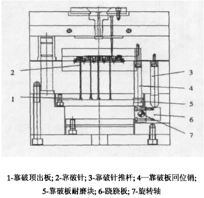 在一次注塑后,模具打开,靠破针在推杆作用下下行,使得跷跷板绕旋转轴旋转,在跷跷板的推动下将靠破顶出板向上顶出,这样靠破针往上运动,将一次产品封闭区域的边界处靠破出一个靠破孔。接着进行二次注塑合模时,在靠破板回位销的作用靠破针往下运动,让出一个圆形的孔,这样二次料就能从靠破孔钻进封闭区域。