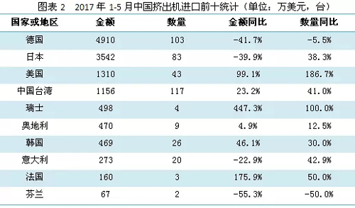 从数据图表2看来,2017年的前5个月中,虽然法国和日本的金额同比减少了41.1%和39.9%,但仍然是中国挤压進口的前俩位。英国则以99.1%的高增福稳居第三。
