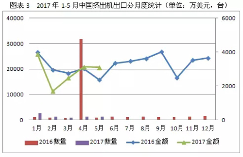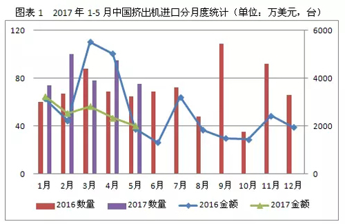 已有人阅读此文 - -2017年1-5月,中国挤出机進口422台,环比升高20.9%;進口金额为12943万美金,同比减少27.2%;出口7098台,同比减少79.9%,出口金额为14288万美金,同比减少5.2%。