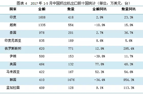 数据图表4数据统计显示信息,1-5月份,印尼仍然是中国挤出机的较大 出口国。越南地区稳居第二位,且降低了10.9%。