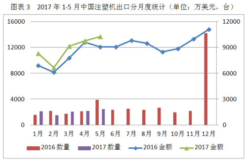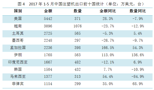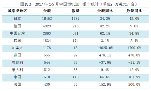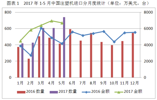 已有人阅读此文 - -2017年1-5月,中国塑料机进口2802台,同比增长率39.0%,进口金额为30420万美元,环比升高39.9%;出口10251台,同比减少10.3%;出口金额为44205万美元,环比升高12.1%。