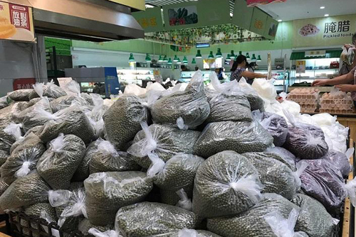 大型商场里,散称产品很多应用塑料袋,加重白色垃圾。