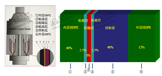 现阶段常见的双层塑料燃油箱一般为六层,如圖所显示其构造是:从内到外分成里层HDPE 、粘接层、隔绝层、粘接层、再生料层、表层HDPE。日益提高的环境保护化和汽车轻量化规定,使塑料燃油箱的要求持续提升。除此之外,双层共挤技术性的发展,使塑料燃油箱的特性优点日益突显。